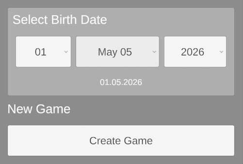 После запуска игры, введите интересующую Вас дату: например день, месяц и год вашего рождения, либо любую дату транзита, и нажмите Create Game.