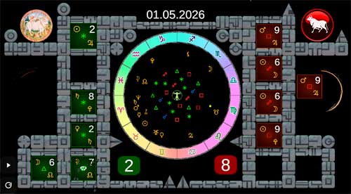Мраморный шарик хаотично прыгает внутри космограммы натального круга и своим столкновением активирует создание карточек, которые распределяются по двум командам: зеленая (гармоничная) и красная (негармоничная).